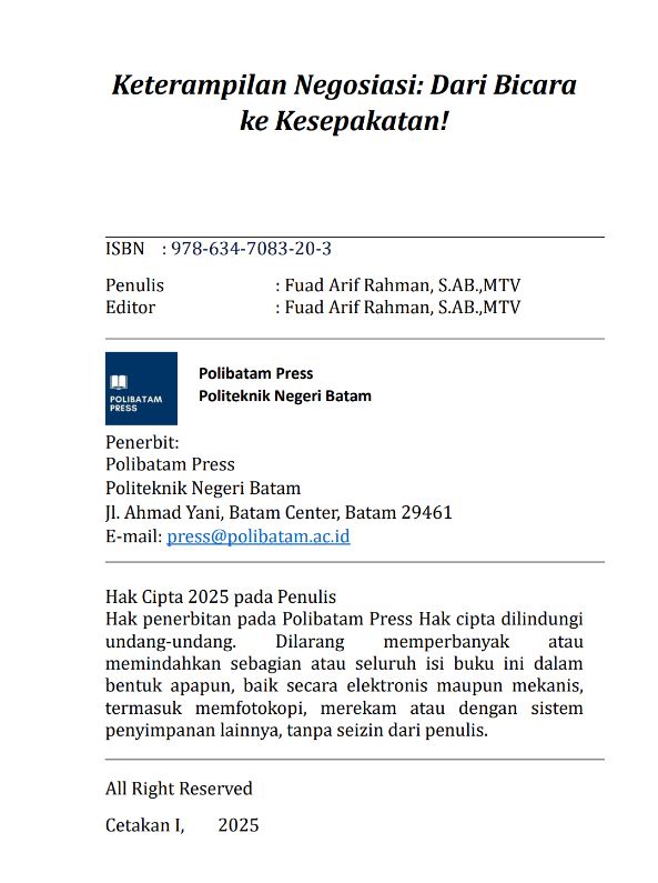 Dengan judul Keterampilan Negosiasi: Dari Bicara ke Kesepakatan, buku ini mencoba menjembataniviii pemahaman tentang bagaimana proses tawar-menawar bukan sekadar tentang menang atau kalah, tetapi tentang bagaimana membangun relasi, memperjuangkan nilai, dan mencapai titik temu yang saling menguntungkan. Buku ini disusun dengan menggabungkan pendekatan ilmiah, pengalaman praktik, serta refleksi dari berbagai studi kasus untuk memperkaya perspektif pembaca dari berbagai latar belakang. Buku ini terdiri dari enam bagian dan disetiap bagian selalu diakhir dengan jurnal negosiator, refleksi diri, catatan negosiator simulasi role play serta mini toolkit yang bertujuan untuk memastikan setiap pembacara dapat mengukur tingkat pengetahuannya dan melatih keterampilan negosiasinya | View | No Access |